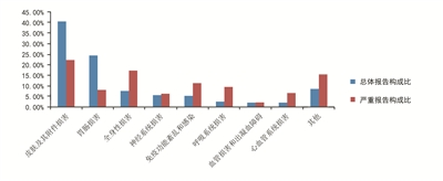 2016年抗感染药物不良反应/事件报告中,与抗感染药的整体报告相比,严重报告的全身性损害、免疫功能紊乱和感染及呼吸系统损害的构成比明显升高(如图所示)。