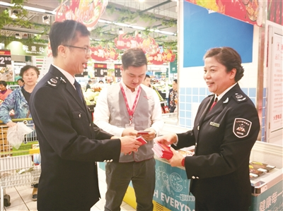 图为近日深圳市局相关负责人在向食品经营者赠送小册子/摄影报道 陈海荣 邹凡