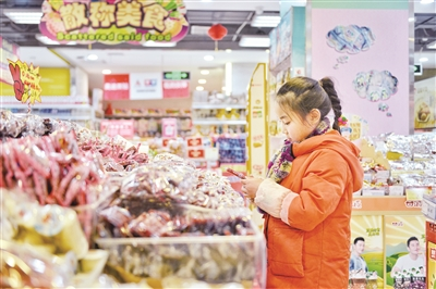 图为小顾客正在散装食品区挑选食品/摄影 董传阳