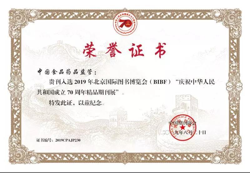 经资格审核和专家遴选,《中国食品药品监管》作为“新中国获奖期刊”入选“庆祝中华人民共和国成立70周年精品期刊展”。