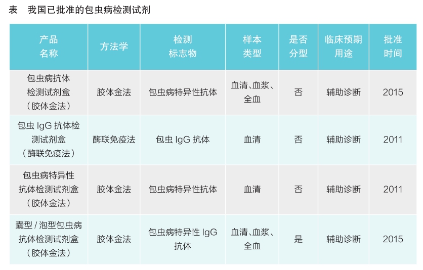 对来源于患者或疑似患者人体样本中的包虫病感染相关生物标志物进行检测是辅助诊断该病的重要手段。相关生物标志物包括特异性抗体、循环抗原、免疫复合物、病原体核酸等。我国已批准四个包虫病抗体检测试剂(见表)。已批准产品均采用免疫学方法对样本中的病原体抗体进行检测,但免疫学检测有其自身的局限性:一方面,由于细粒棘球蚴和多房棘球蚴两种病原体自身抗原存在交叉,导致应用抗体检测来区分囊型/泡型的效果欠佳;另一方面,抗体检测无法区分现症感染与既往感染。