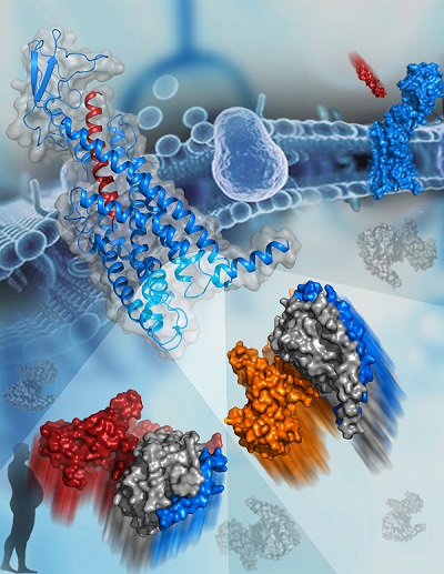 胰高血糖素受体GCGR的三维结构示意图。GCGR参与调节人体内血糖稳态,是治疗2型糖尿病药物的重要靶点。图中左上角GCGR的三维结构以蓝色飘带图显示,GCGR的天然配体胰高血糖素以红色飘带显示;图下方为与GCGR结合的两种G蛋白,以表面图显示,其中,Gs蛋白的三个亚基分别用橙色、灰色和蓝色显示,Gi蛋白的三个亚基分别用红色、灰色和蓝色显示。(图片由中科院上海药物所吴蓓丽研究组提供)