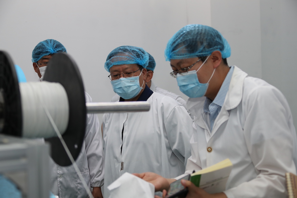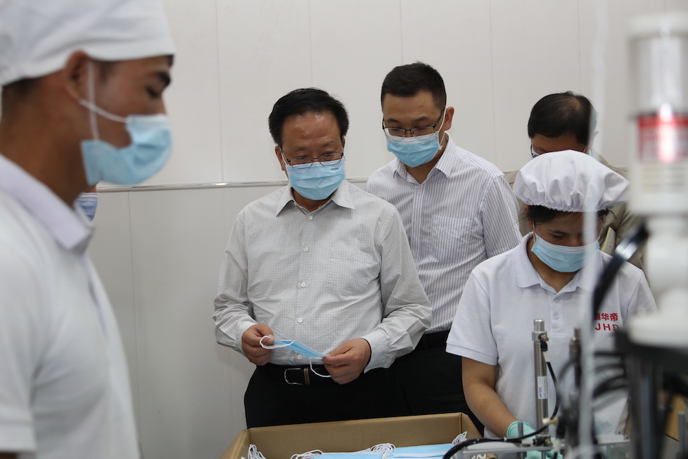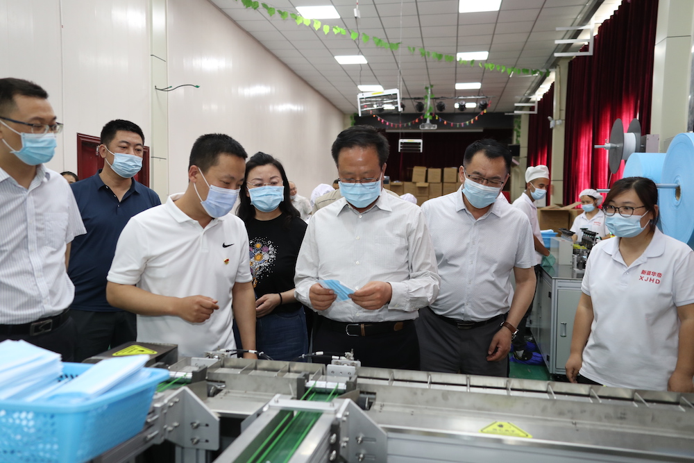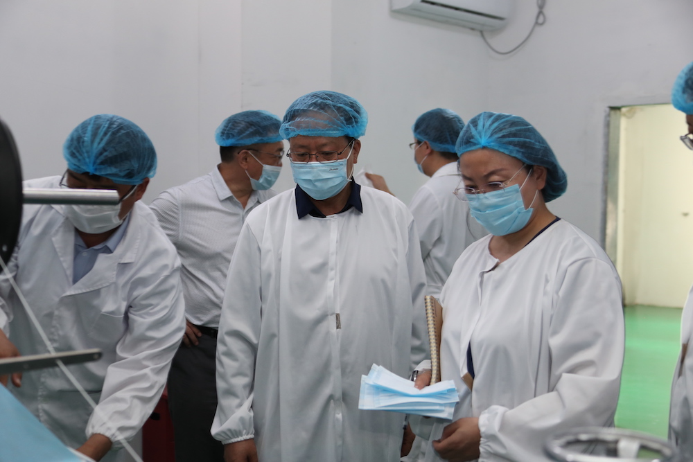 新疆维吾尔自治区药监局党组书记、局长张钰祥(右二)带队赴吐鲁番市调研口罩生产企业。(马少宾 摄)