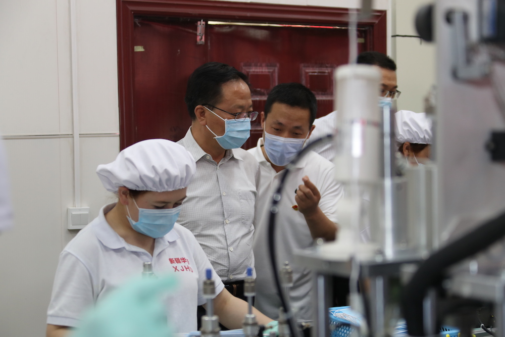 新疆维吾尔自治区药监局党组书记、局长张钰祥(中)带队赴吐鲁番市调研口罩生产企业。(马少宾 摄)