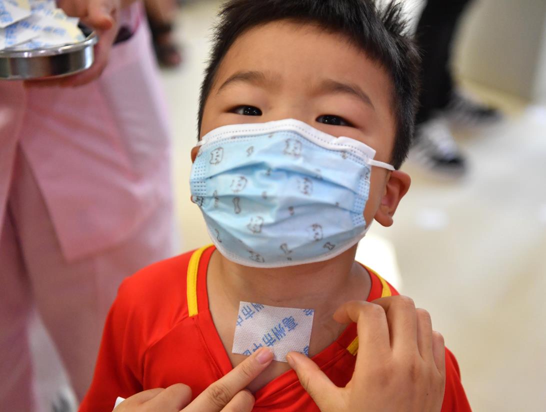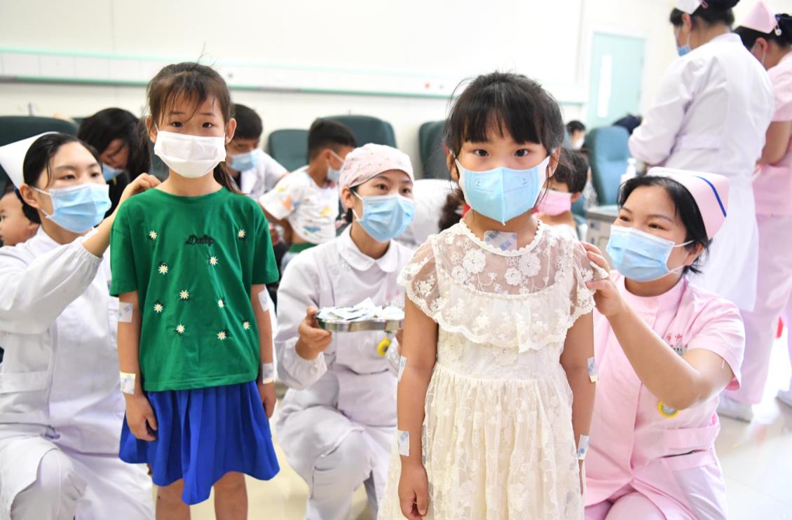6月21日是农历二十四节气中的夏至,许多市民及儿童来到安徽省亳州市中医院,接受“冬病夏治”中医疗法。图为医护人员为小朋友贴“三伏贴”。(刘勤利 摄)