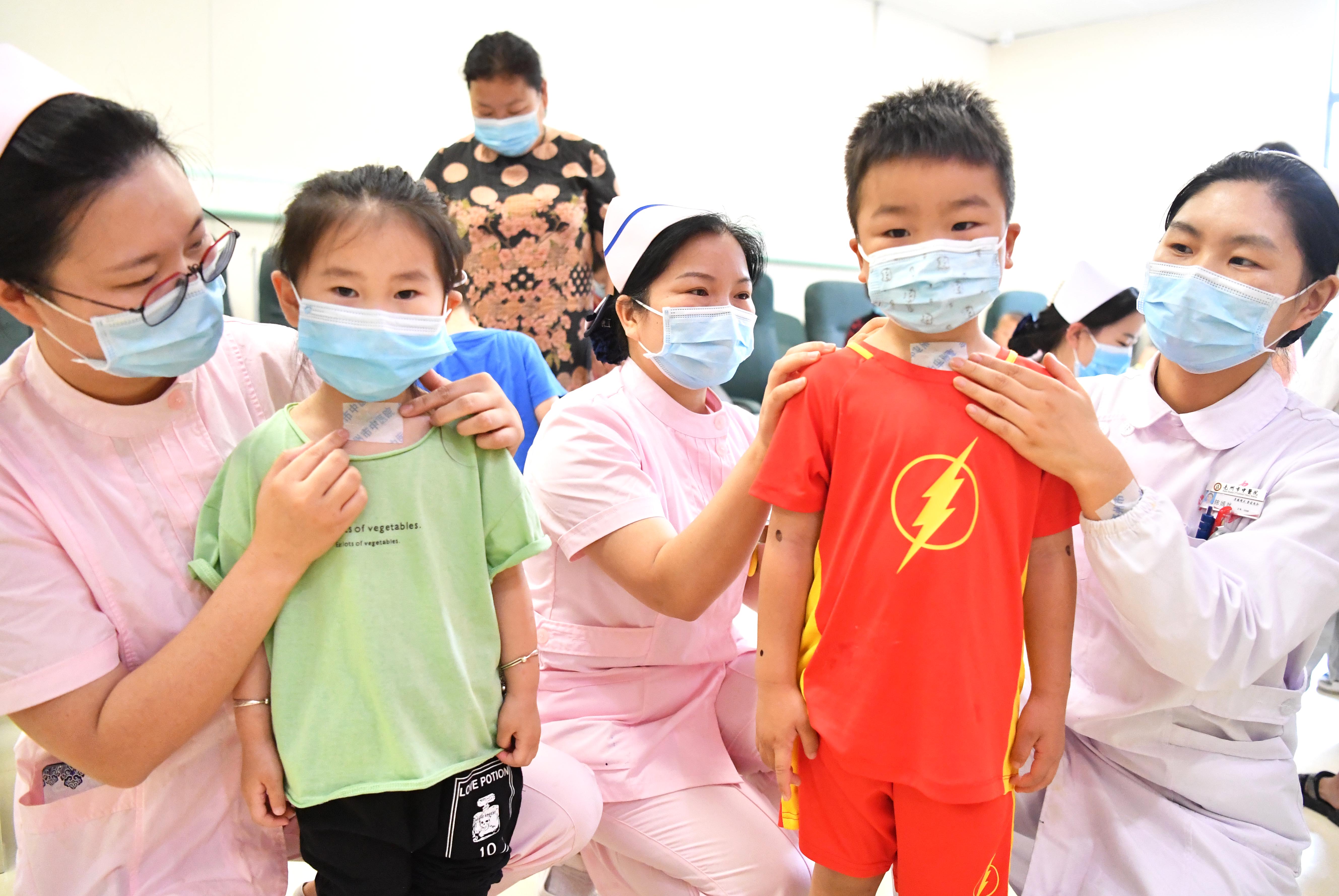 6月21日,在安徽省亳州市中医院,医护人员为小朋友贴“三伏贴”。(刘勤利 摄)