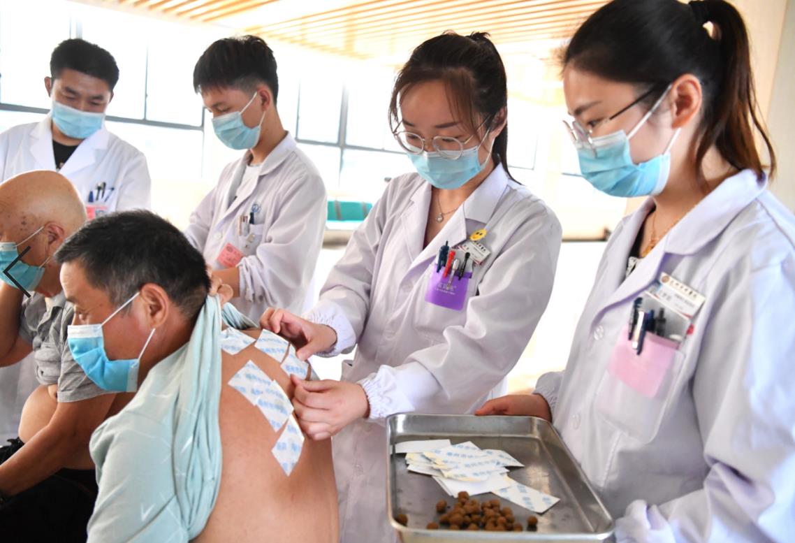 6月21日,在安徽省亳州市中医院,医护人员为市民贴“三伏贴”。(刘勤利 摄)