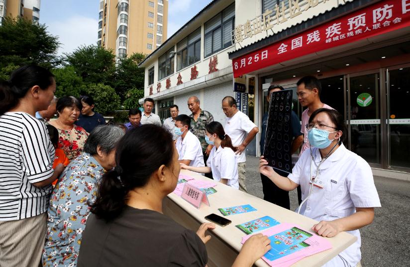 图为峄城区残疾人联合会组织医务人员走进鹭鸣山庄社区为居民进行义诊宣传。(吉喆 摄)