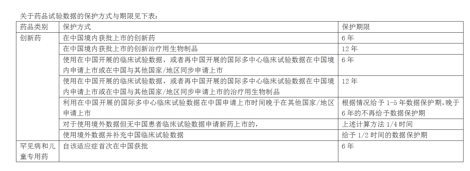 关于药品试验数据的保护方式与期限见下表: