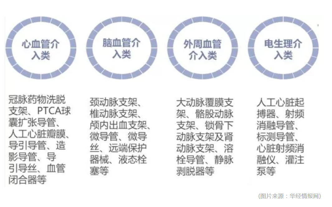 血管介入器械可分为心血管介入器械、脑血管介入器械、外周血管介入器械与电生理介入器械: