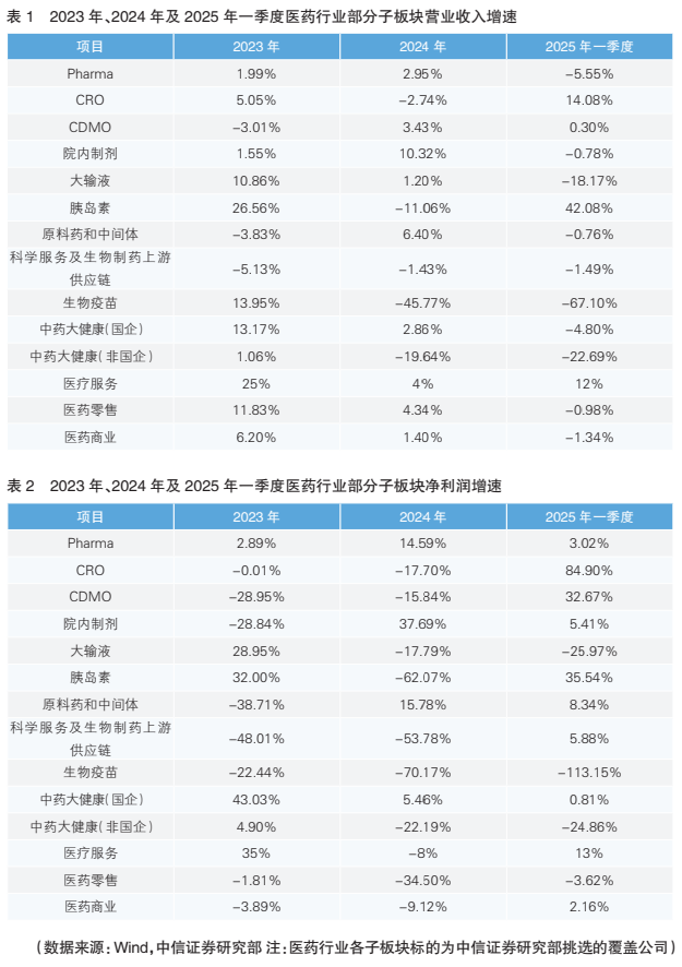 尽管2024年和2025年一季度医药板块整体业绩承压,但部分子板块成绩亮眼,呈现出向好的潜力。(详见表1、表2)
