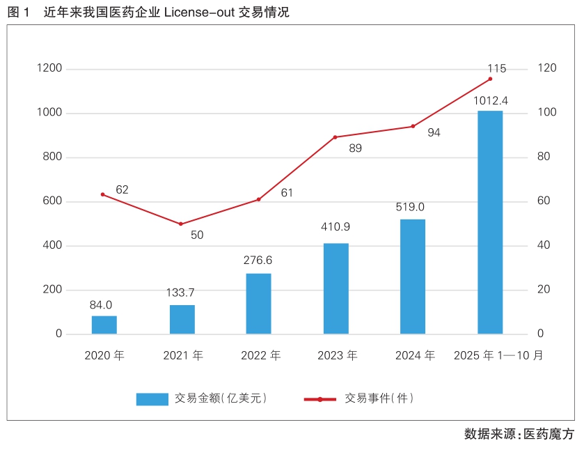 我国医药产业在“十四五”期间持续加大研发投入,创新能力显著提升,正逐步从仿制药大国向创新药强国迈进。产品研发方面,一批具有重要临床价值的创新药和医疗器械成功上市,覆盖抗肿瘤、心血管、神经系统等多个疾病治疗领域。Pharmaprojects数据库今年发布的《2025年医药研发年度回顾》显示,中美两国领跑全球医药创新研发。其中,美国仍处于全球医药创新的中心地位,参与研发的药物数量达11455个,占比48.0%;中国保持快速追赶态势,研发项目数量达7032个,占比29.5%,较2023年的26.7%提升近3个百分点。中美两国新药研发数量差距已缩小至不足200个,而5年前差距尚达数千项。研发平台方面,基因工程、蛋白质工程、高通量筛选等先进技术广泛应用于新药研发,有效缩短了研发周期、提高了研发效率。研发合作机制方面,产学研协同不断深化,企业、高校、科研机构之间形成良好创新协同机制,加速了科技成果转化。在BD(商务拓展)交易领域,中国已成为全球医药BD交易的主要参与国之一。根据医药魔方数据,2025年1—10月,我国医药企业License-out交易总额突破1000亿美元,是2020年全年的10倍以上(详见图1)。