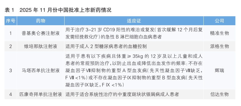 2025年11月份,我国共批准4款新药上市。根据Pharmadigger数据库,其中除马塔西单抗注射液外,其余3款均为我国企业自主研发的全球范围内首次获批上市的新药(详见表1)。