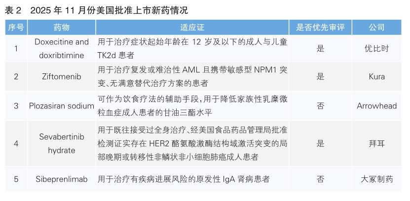 2025年11月份,美国批准上市5款新药。根据Pharmadigger数据库,5款新药均为全球范围内首次获批(详见表2)。