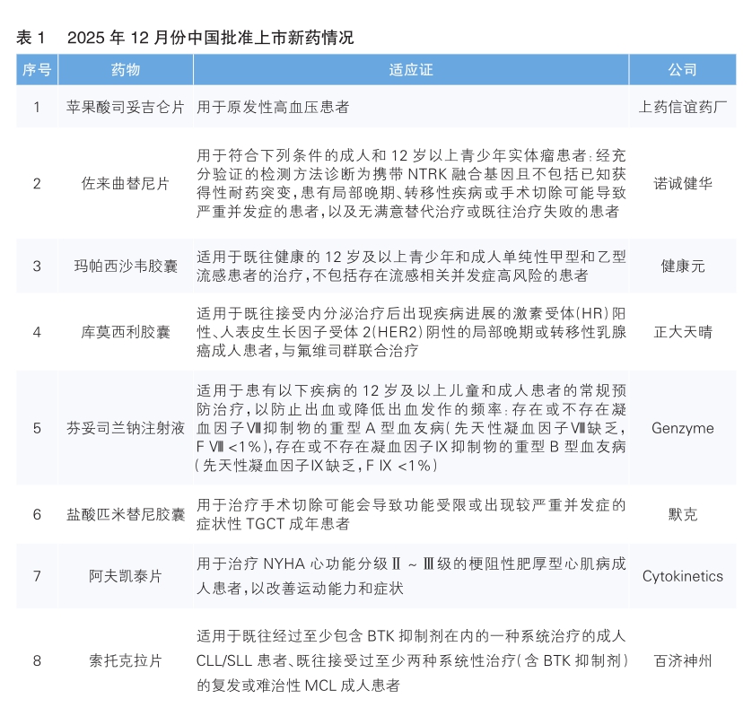 2025年12月份,我国共批准8款新药上市。根据Pharmadigger数据库,其中佐来曲替尼片、库莫西利胶囊、盐酸匹米替尼胶囊和索托克拉片为我国企业自主研发的全球范围内首次获批上市的新药(详见表1)。