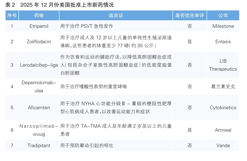 2025年12月份,美国批准上市7款新药。根据Pharmadigger数据库,7款新药均为全球范围内首次获批(详见表2)。