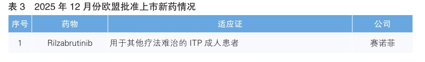 2025年12月份,欧盟批准1款新药上市。根据Pharmadigger数据库,该药并非全球首次获批(详见表3)。
